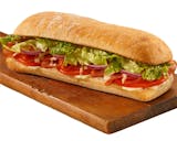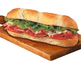 Generous cuts of turkey breast and ham, bacon and mozzarella cheese topped with red onions, fresh lettuce, ripe tomatoes, and mayonnaise.