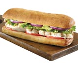 Turkey breast, creamy mozzarella cheese, red onions, fresh lettuce, ripe tomatoes, and mayonnaise.