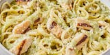 A culinary blend of basil pesto, chicken, romano cheese & alfredo sauce over a generous bed of linguini.