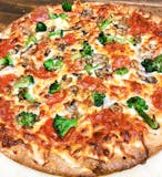 Tony's traditional pizza with meatball, Italian sausage, pepperoni, black olives, sliced fresh mushrooms, white onions and green peppers. Anchovies optional.