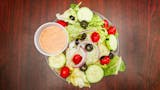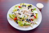 Lettuce, cucumbers, tomatoes, olives, red onions, and feta cheese. Served with Greek dressing on the side. Add grilled chicken.