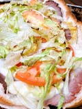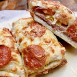 Homemade dough stuffed with ham, Genoa and cooked salami, provolone and shredded mozzarella and cheddar cheeses, banana peppers, sliced tomatoes and onions, topped with shredded cheese and pepperoni.