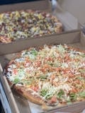 Fresh stretched white dough cooked with cheese and bacon, topped with sour cream and chopped potato skins.