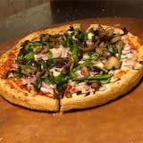Pepperoni, sausage, mushrooms, roasted peppers, grilled onions, tomato sauce & blended cheese.