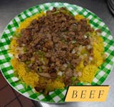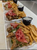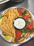 Lamb, lettuce, onion, tomato, tzatziki sauce with french fries.