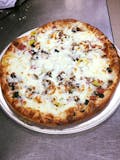 Fresh hamburger, pepperoni, sausage, ham, fresh mushrooms, onions, black olives, banana peppers.