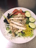 Available from Monday-Friday from 10:30 am - 3:00 pm only. Green mix lettuce, tomatoes, onions, cucumbers, banana peppers and black olives.