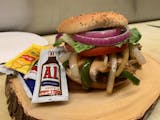 Burger patty topped with melted pepper jack cheese, smothered mushrooms & green peppers, french fried onions top off with A1 steak sauce.