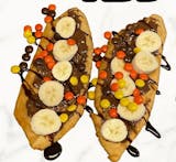 Great Canadian moose knuckle dough, topped with hazelnut spread, banana, chocolate sauce, and peanut butter candies.