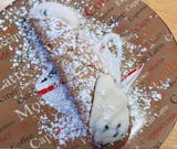 A chocolate chip cream in a cannoli shell, topped with powdered sugar.