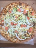 Homemade ranch base with mozzarella cheese, grilled chicken, bacon topped with Chris hot sauce drizzle and Chives.