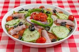 A tasteful combination of fresh lettuce, tomatoes, red onions, black olives, cucumbers, green peppers, stuffed sweet cherry peppers, provolone cheese, Genoa salami, and capicola ham.
