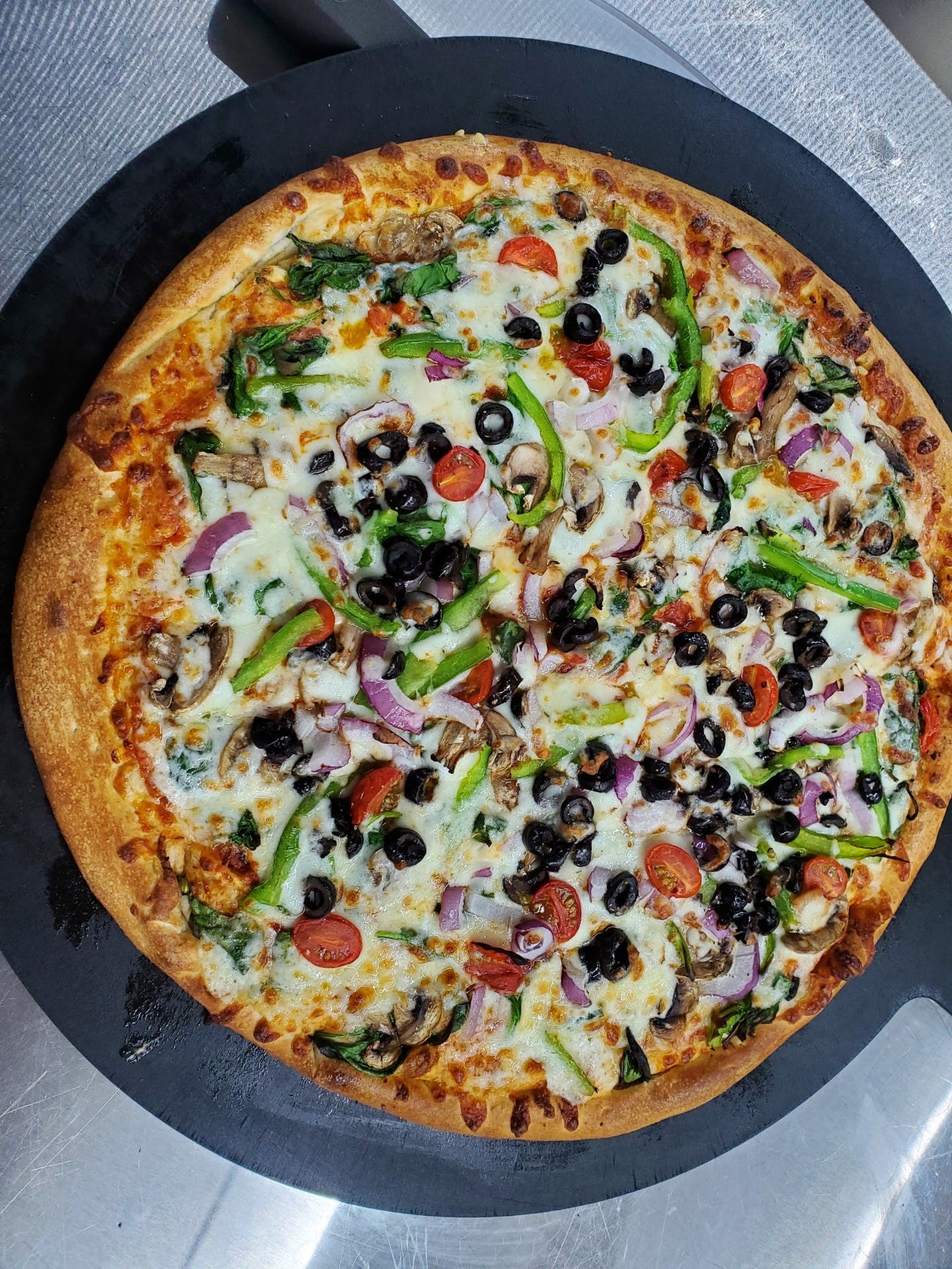 Mozzarella, tomato, green pepper, onion, mushroom, baby spinach & black olives.