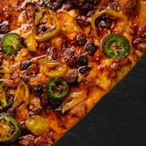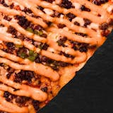 Nashville-style hot chicken pizza with spicy chicken blend, jalapeno, banana peppers, dill parm shake, and hot honey drizzle.