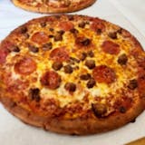 Made with a 12" round gluten-free crust. S+H meat cravers pizza with OG red sauce house blend cheese, pepperoni, ham, ground beef, and sausage.
