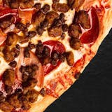 S+H meat cravers pizza with OG red sauce house blend cheese, pepperoni, ham, ground beef, and sausage.