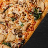 Slammin white sauce, spinach, house cheese, smoked chicken w/ onion and mushrooms.