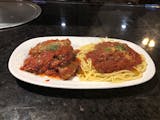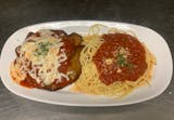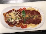 Breaded chicken breast with marinara and melted mozzarella cheese with spaghetti.