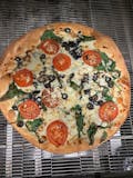 Olive oil base, spinach, tomatoes, black olives & feta.