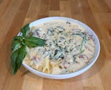 Sautéed spinach, mushrooms & bacon with garlic in alfredo.