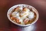 Homemade meatball, marinara sauce topped with mozzarella cheese.