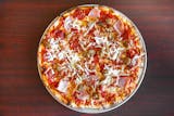 Mozzarella cheese, tomato sauce, pepperoni, sausage, mushroom, peppers, olives, and onion.