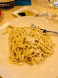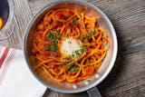 Large hollowed spaghetti served in a traditional Italian pasta sauce based on guanciale (cured pork cheek), pecorino cheese, spicy tomato & onion.