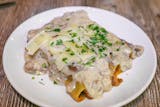 Tube-shaped fresh pasta filled with ground veal and ricotta cheese served in a creamy mushroom sauce.