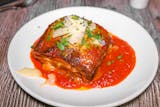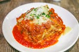 Gluten-free. Classic eggplant parmigiana, prepared lasagna style, with tomato sauce, basil & fresh mozzarella.