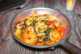 Homemade black liquid tagliolini with spicy cherry tomato and spicy tomato sauce served with sea scallops and jumbo shrimps.