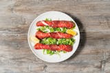 Fresh sliced mozzarella and tomatoes, roasted peppers, drizzled with EV olive oil.