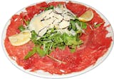 Thinly sliced raw beef, topped with arugula, shaved parmesan cheese, drizzled with EV olive oil, and reduced balsamic.