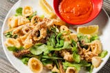 Baby arugula tossed with blanched fennel and onions, green apples, caramelized walnuts tossed in a lemon balsamic vinaigrette topped with shaved parmesan cheese.
