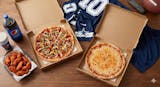 1 Large Specialty Pizza + 1 Large Cheese Pizza + 16 Wings + 2-Liter Soda Built for sports nights and hungry crews.