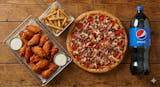 One large specialty pizza, 16 bone-in wings, and a 2-liter soda.