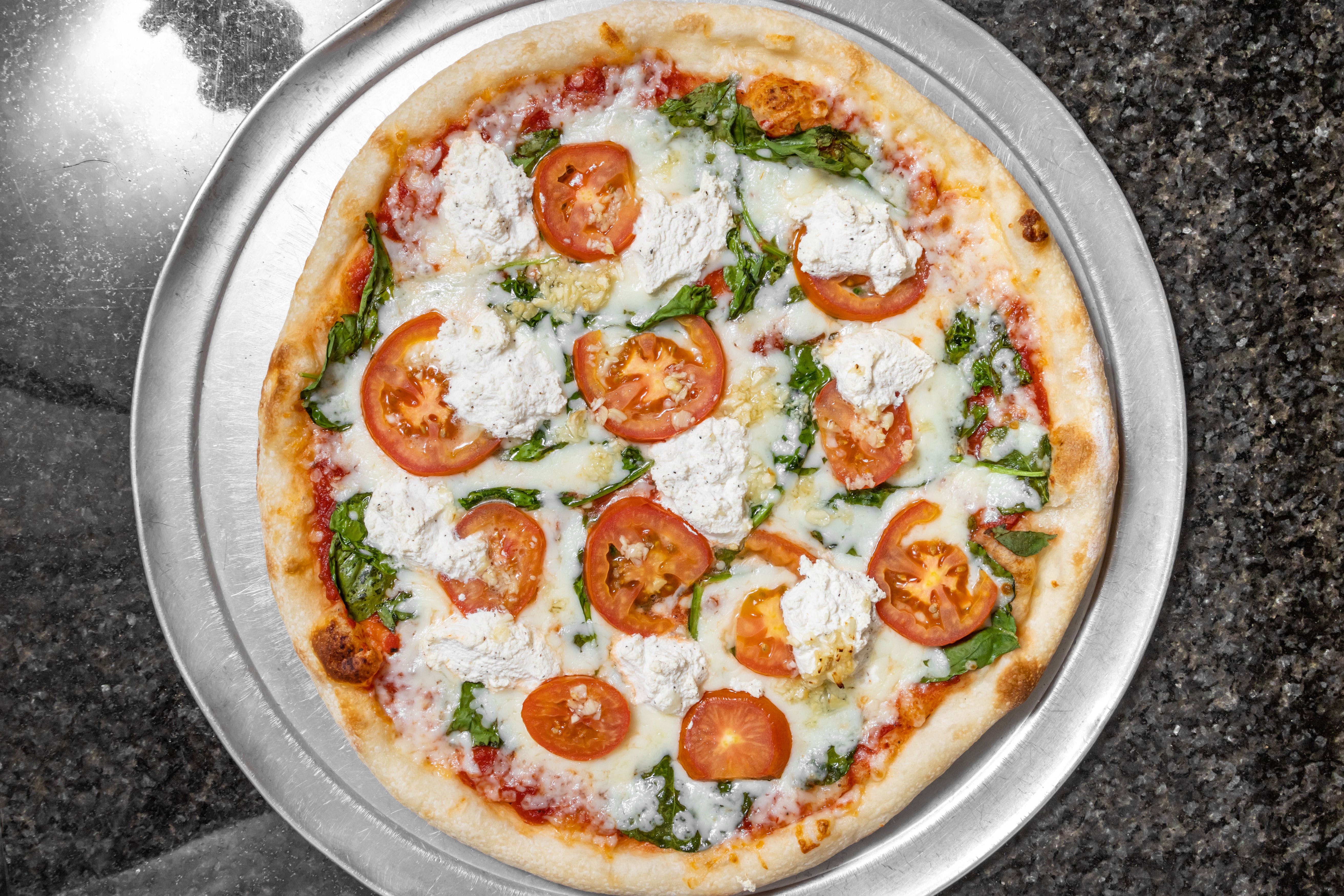 Spinach, fresh garlic, fresh tomatoes, ricotta and mozzarella cheese.