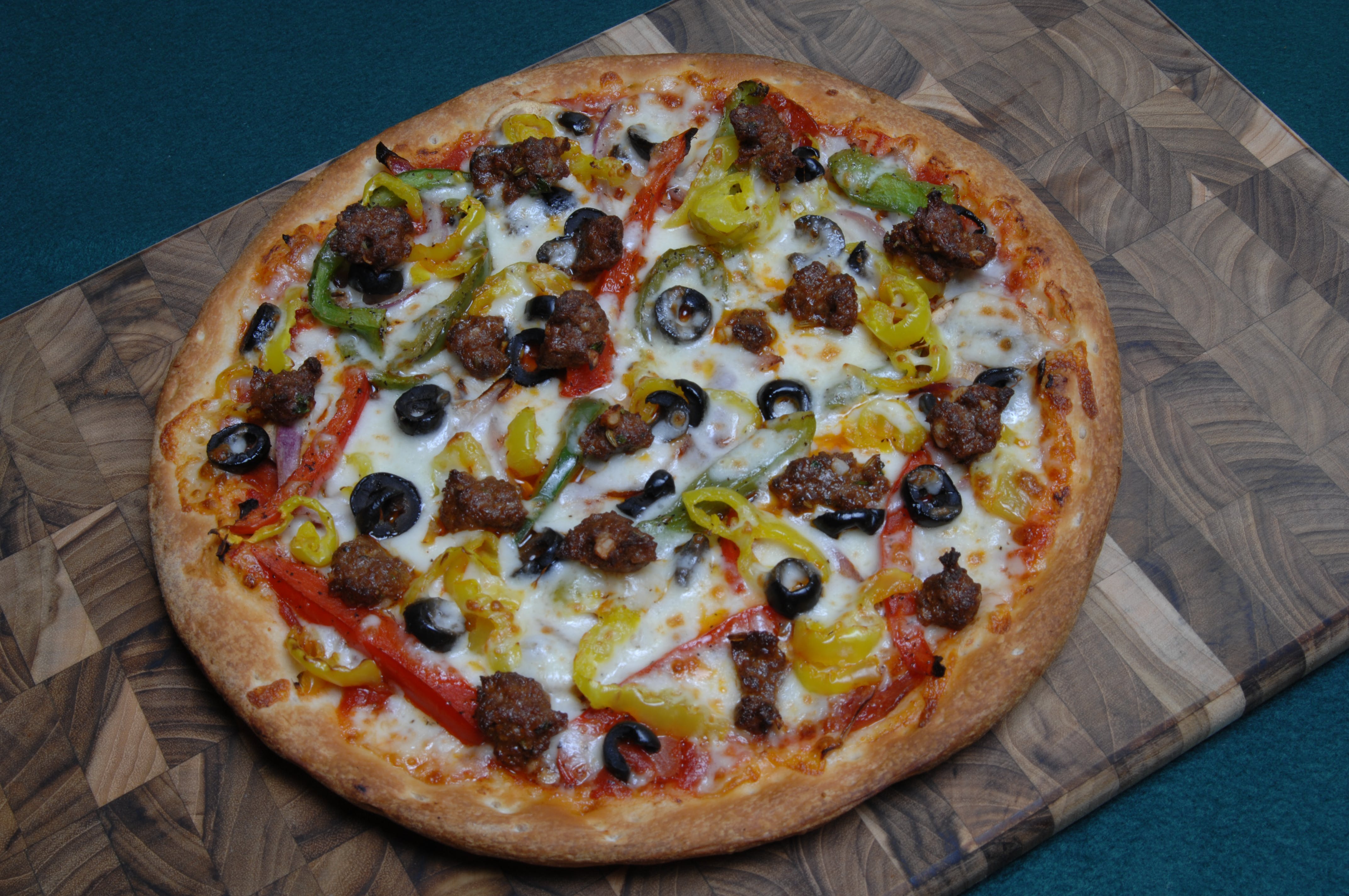 Tomato sauce, pepperoni, Italian sausage, Turkey bacon, roasted peppers, black olives, red onions, banana peppers, mushrooms & mozzarella cheese.