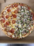 Tomato sauce, pepperoni, mushrooms, Italian sausage, onions, mixed bell peppers & mozzarella cheese.