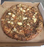 Alfredo sauce, organic spinach, mushrooms, black olive, garlic, oregano, feta & mozzarella cheese.