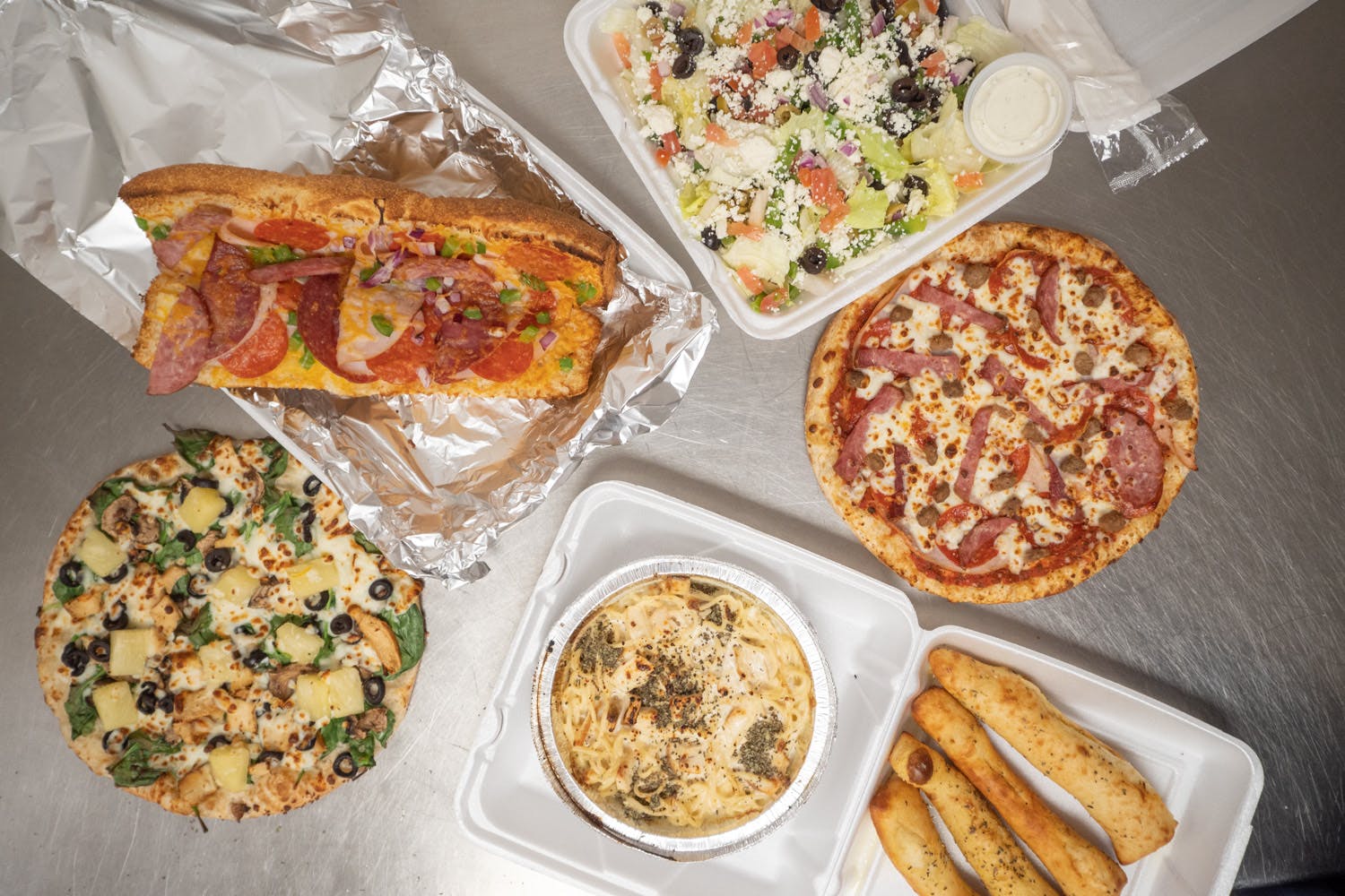 Tomato sauce, pepperoni, beef, Italian sausage, bacon, mushrooms, black olives, onions, mixed bell peppers & mozzarella cheese.