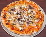 Tomato sauce, mozzarella cheese, Kalamata olives, Bulgarian cheese, red onion, za'atar.