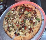 Balsamic vinaigrette as the sauce, feta cheese, artichoke hearts, kalamata olives, fresh spinach, roasted garlic and sun-dried tomatoes.