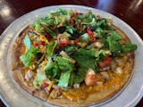 BBQ -ranch combo base, pepper jack, and cheddar cheese with chicken baked crisp. This pizza is topped with a cold, tossed salad of BBQ sauce, romaine lettuce, black beans and roasted corn, hatch chilis, red onions and tri-colored tortilla strips.