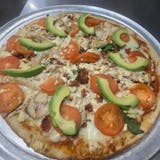 Red sauce and alfredo, mozzarella and feta cheese, garlic, bacon, spinach, chicken, Roma tomatoes and topped with sliced avocado.