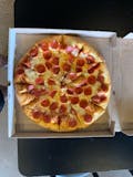 Red sauce, mozzarella, pepperoni, bacon, sausage, meatballs, black olives, mushrooms, green bell peppers and onions.