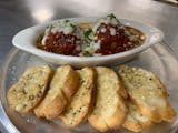 Raging bull is served with marinara sauce, meatballs, mozzarella cheese, and parmesan cheese.