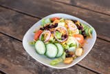Antipasto salad is served with capicola, Kalamata olives, mozzarella cheese, parmesan cheese, pepperoncini, pepperoni, provolone cheese, Roma tomato, romaine lettuce, salami.