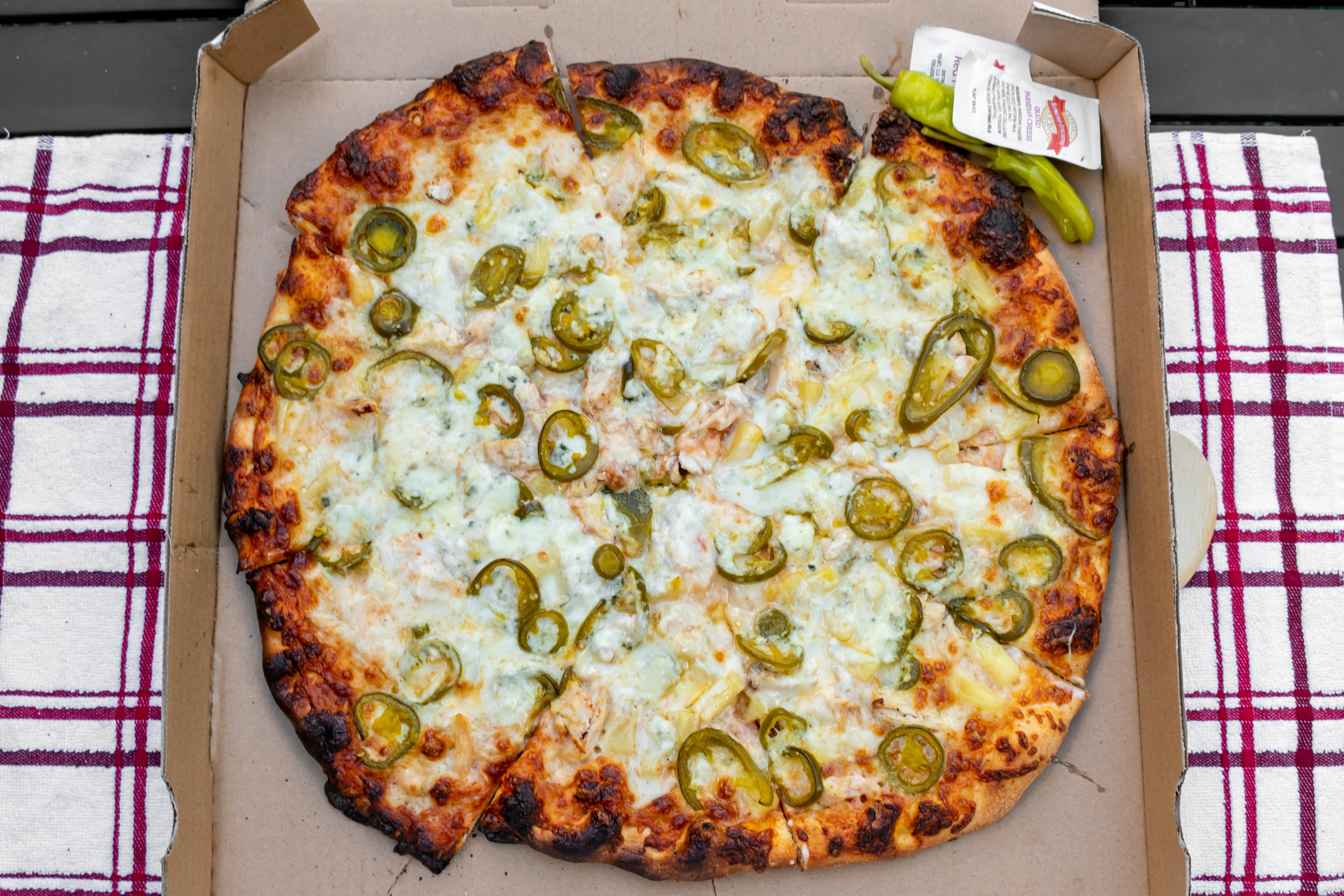 Chicken, gorgonzola, pineapple, jalapenos.