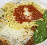 Lightly breaded chicken breast with tomato sauce, melted mozzarella & parmesan cheese.