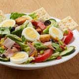 Crisp lettuce, cucumbers, red onions, tomatoes, hard boiled eggs, black olives, green peppers, ham, cheddar cheese, bacon bits, served with croutons, saltines, and a side of Ranch dressing.